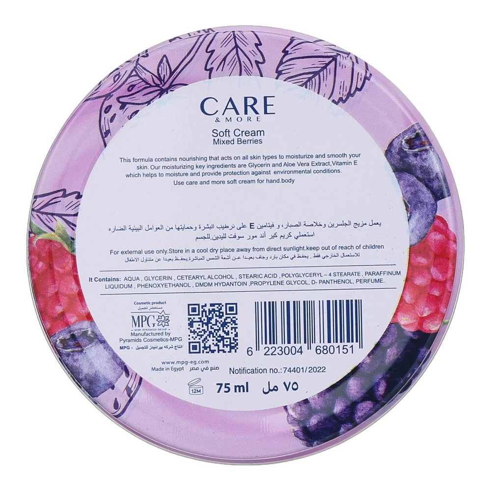 كير اند مور كريم مرطب بالتوت البرى 75 مل - يقدم لك ترطيباً عميقاً للبشرة مع التركيبة الفريدة من الجلسرين والتوت المتنوع. هذا الكريم المثالي مناسب لجميع أنواع البشرة ويعمل على الحفاظ على نعومة وحيوية الجلد. استمتع بفوائد التوت البرى الذي يساعد في تجديد الخلايا وتعزيز إشراقة البشرة. إضافة رائعة إلى روتين العناية بالبشرة الخاص بك، يوفر نتائج ملموسة تجعلك تشعر بالانتعاش كل يوم.