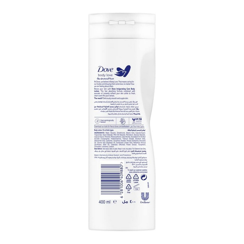 استمتع بتجربة العناية بالبشرة الفاخرة مع لوشن الجسم دوف Body Love Invigorating Care Avocado Oil and Calendula. يقدم هذا اللوشن تركيبة غنية تحتوي على الزيوت الطبيعية بنسبة 100%، مما يجعله مثالياً للبشرة الجافة جداً. يساهم في تحسين ملمس بشرتك من خلال ترطيب فوري يدوم حتى 72 ساعة، مما يمنحك شعوراً بالانتعاش والحيوية. امنح جسمك الحب الذي يستحقه من خلال العناية اليومية والامتياز. استخدمه بعد الاستحمام لتدليل بشرتك والتخلص من أي قشور جافة. جميع زجاجاتنا مصنوعة من البلاستيك المعاد تدويره بنسبة 100%، مما يعكس التزام دوف بالاستدامة. دون القلق بشأن حقوق الحيوانات، حيث إن منتجاتنا معتمدة من بيتا وغير مختبرة على الحيوانات، ما يجعل خيارك مع دوف خياراً واعياً ومحباً للبيئة. جربه اليوم واستمتع ببشرة ناعمة وجميلة.