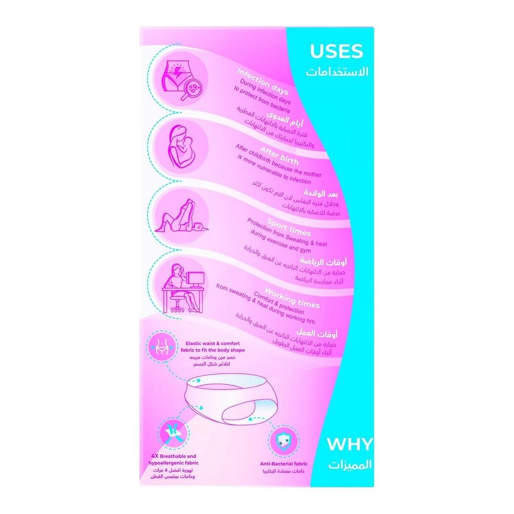 دراى جو ملابس داخلية استخدام مرة واحدة 3XL علبة 5 قطعة أول ملابس داخلية صحية للاستعمال مرة واحدة مصممة خصيصًا لحمايتك من العدوى الفطرية والبكتيرية التي تسبب الالتهاب في منطقة البيكيني. تتميز دراى جو بمكونات مضادة للبكتيريا التي تحبس البكتيريا والفطريات داخل الأنسجة، مما يمنعها من الوصول إلى منطقة البيكيني ويحمى من الالتهابات المهبلية المتكررة. توفر هذه الملابس الداخلية تهوية أفضل أربع مرات مقارنة بالملابس التقليدية، مما يقلل درجات الحرارة، أحد أبرز أسباب العدوى، مما يجعل المنطقة الحميمة جيدة التهوية. استخدامات دراى جو تشمل: بعد الولادة مع الفوط الصحية المخصصة لذلك، حيث تتعرض النساء لزيادة مخاطر العدوى والالتهابات، ويفضل استخدام 3 إلى 4 قطع خلال فترة ما بعد الولادة. كما أنها مثالية لفترات العدوى الفطرية أو البكتيرية في منطقة البيكيني، مما يجعلها خيارًا مثاليًا للصحة والراحة.