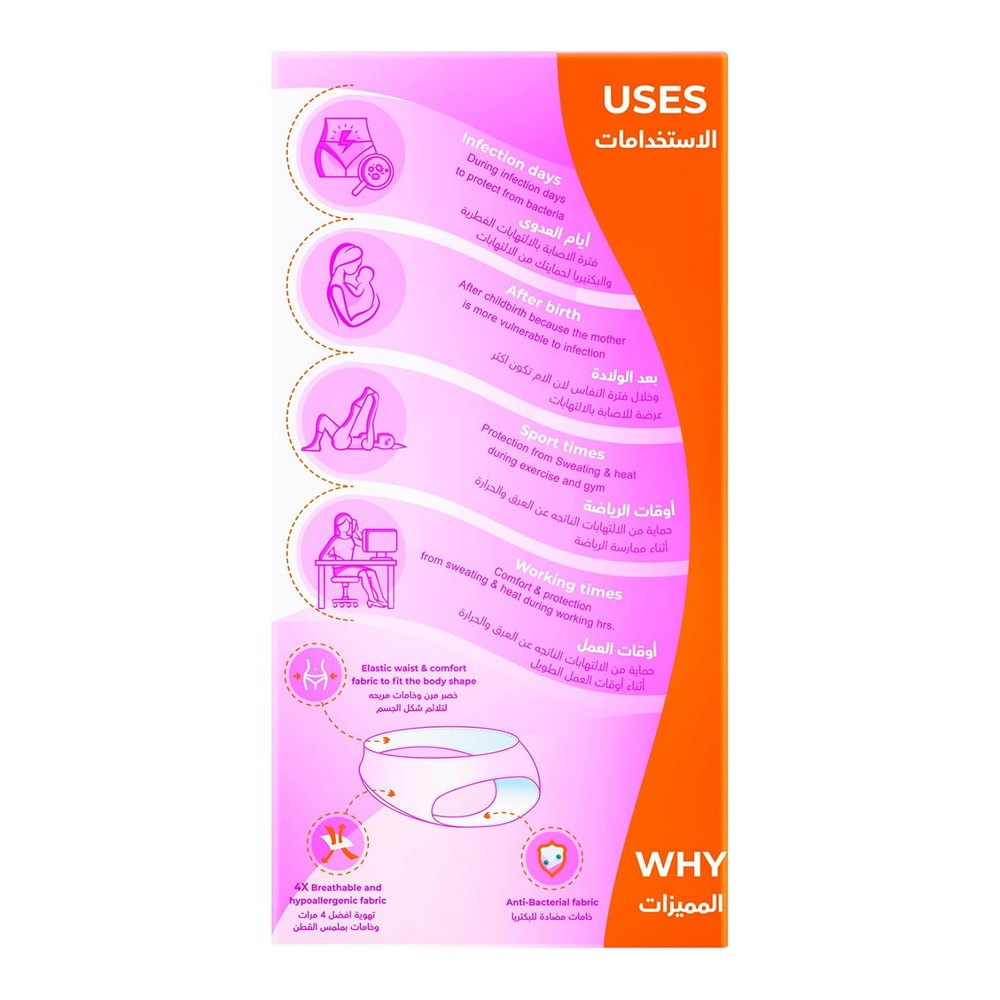 دراى جو ملابس داخلية استخدام مرة واحدة XL علبة 6 قطعة أول ملابس داخلية صحية للاستخدام مرة واحدة، مصممة خصيصًا لحمايتك من العدوى الفطرية والبكتيرية التي تسبب الالتهابات في منطقة البيكيني. يتميز منتج جاف جو بعدة فوائد: مصنوع من مواد مضادة للبكتيريا تحبس البكتيريا والفطريات داخل الأنسجة، مما يمنع وصولها إلى منطقة البيكيني، ويحميك من الالتهابات المهبلية المتكررة. كما توفر التهوية أفضل 4 مرات من الملابس الداخلية العادية، مما يقلل من درجة الحرارة، وهو أحد الأسباب الرئيسية للعدوى، وبالتالي تحافظ على منطقة حميمة جافة ومريحة. مثالي للاستخدام بعد الولادة عند استخدام الفوط الصحية الخاصة، فهو يوفر حماية إضافية نظرًا لكون فترة ما بعد الولادة أكثر عرضة للعدوى. يُنصح باستخدام 3 إلى 4 زجاجات خلال هذه الفترة، كما يعتبر مثاليًا أيضًا في حالات العدوى الفطرية أو البكتيرية. حافظي على صحتك واختاري داي جو!