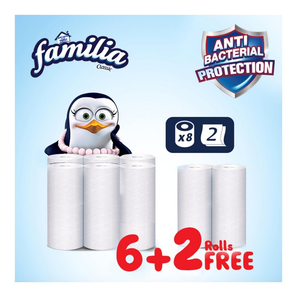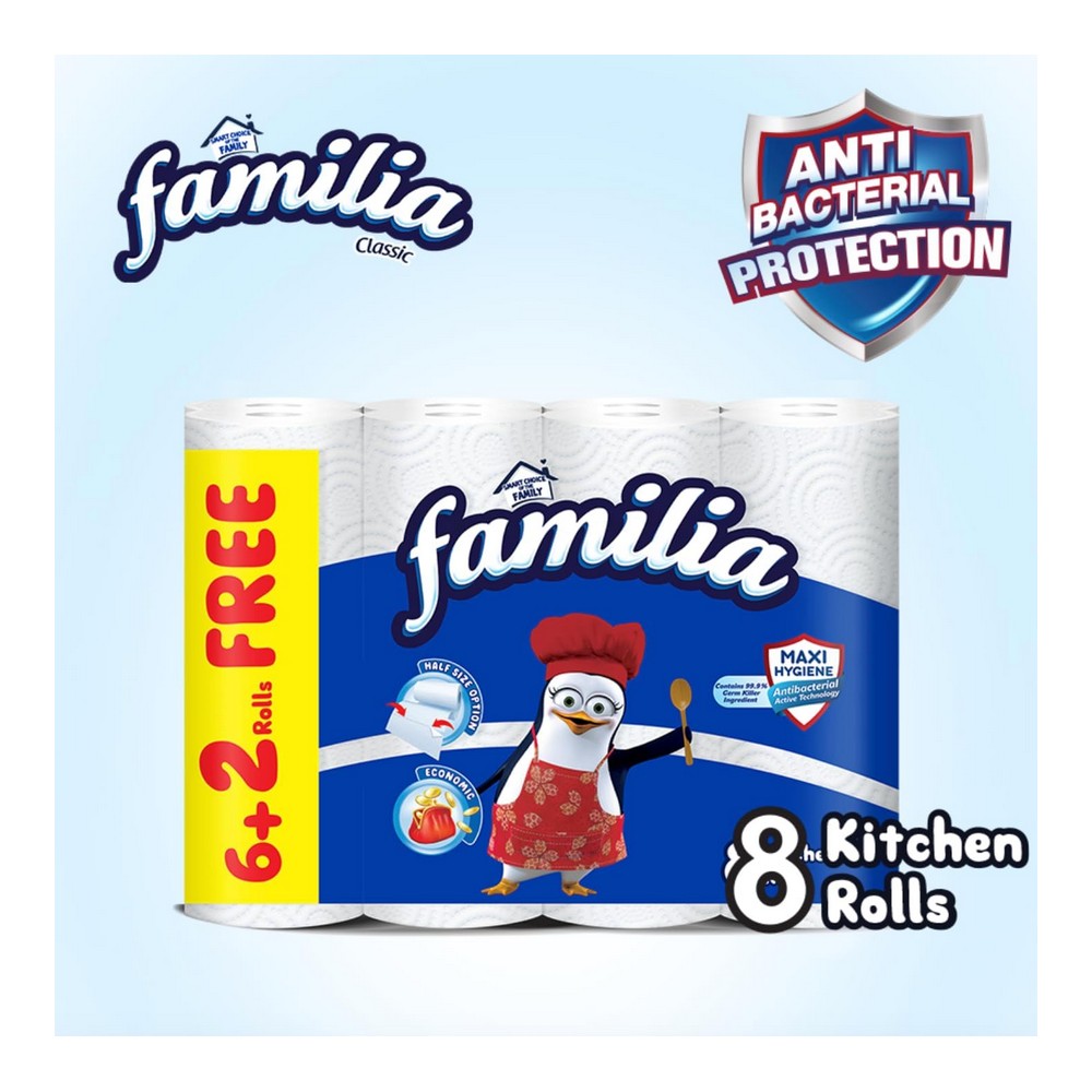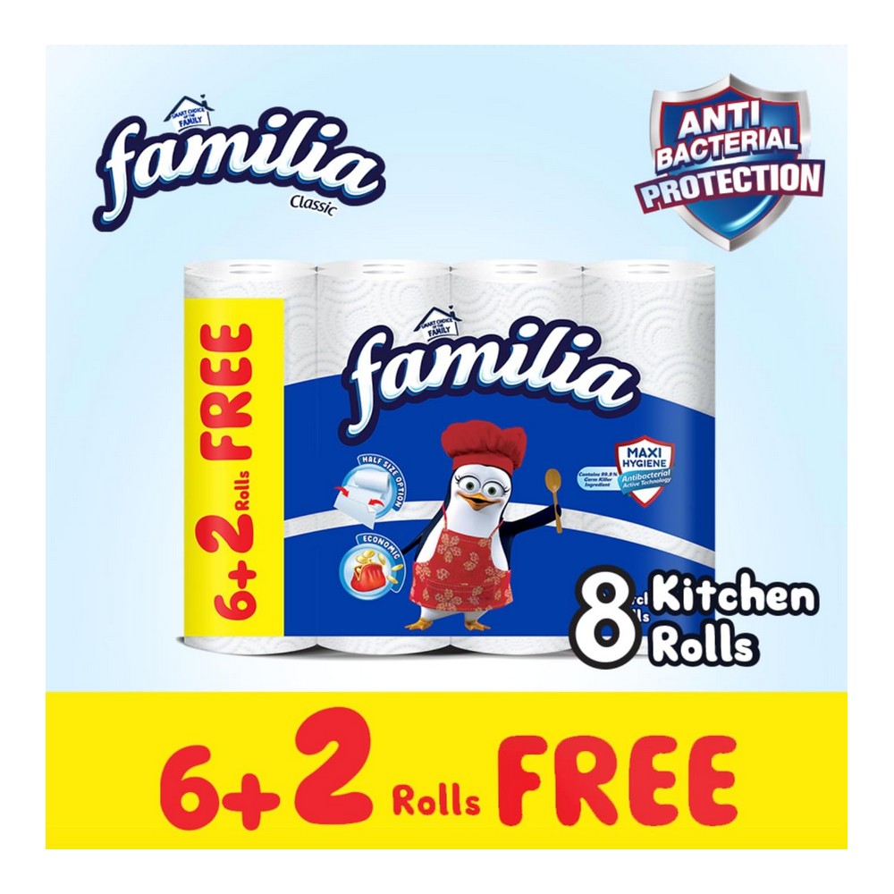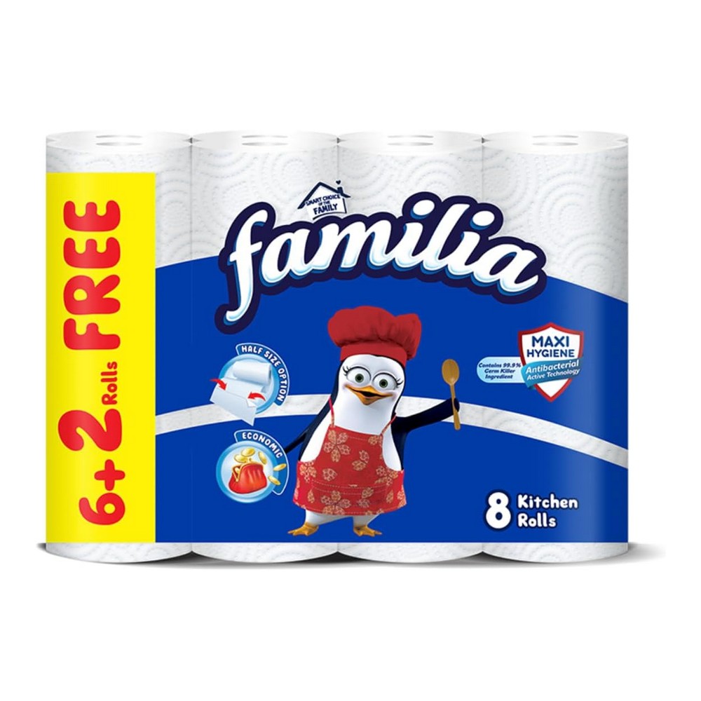 فاميليا مناديل مطبخ بكر رول 6+2 رول || مناديل مطبخ فاميليا ذات تصميم مبتكر يمتص السوائل بسرعة فائقة، مثالية للاستخدام اليومي في المطبخ. تحتوي العبوة على 8 بكرات طوية، مما يضمن لك الحصول على أداء يدوم طويلاً. حجمها الملائم يسهل تخزينها ويوفر المساحة في مطبخك. اختبر جودة مناديل فاميليا التي تجمع بين الفعالية وسهولة الاستخدام، مثالية لتنظيف السطح وتجفيف الفواكه والخضروات.
