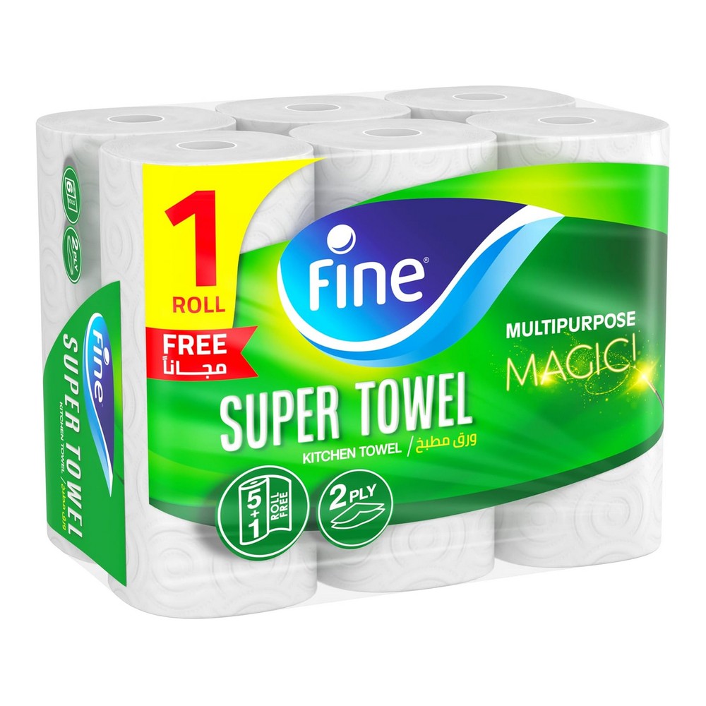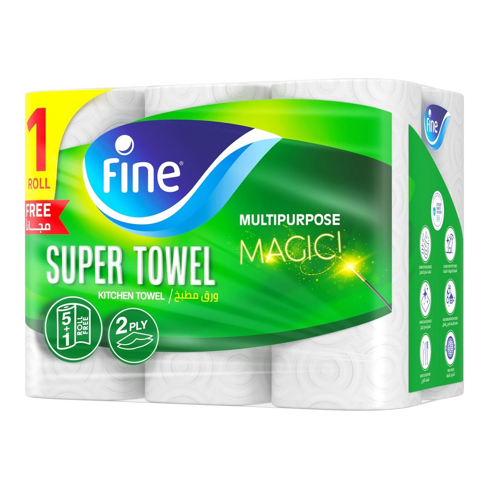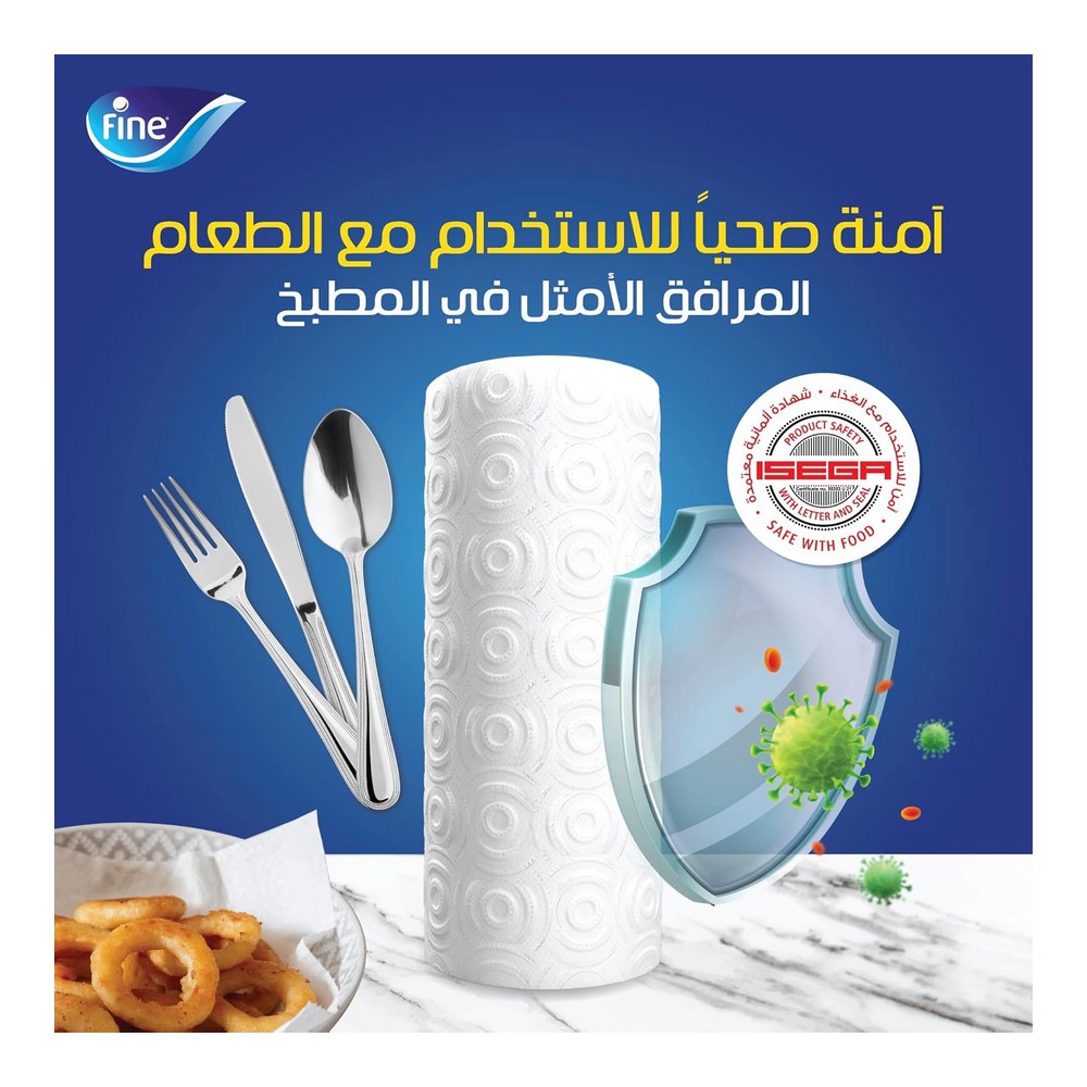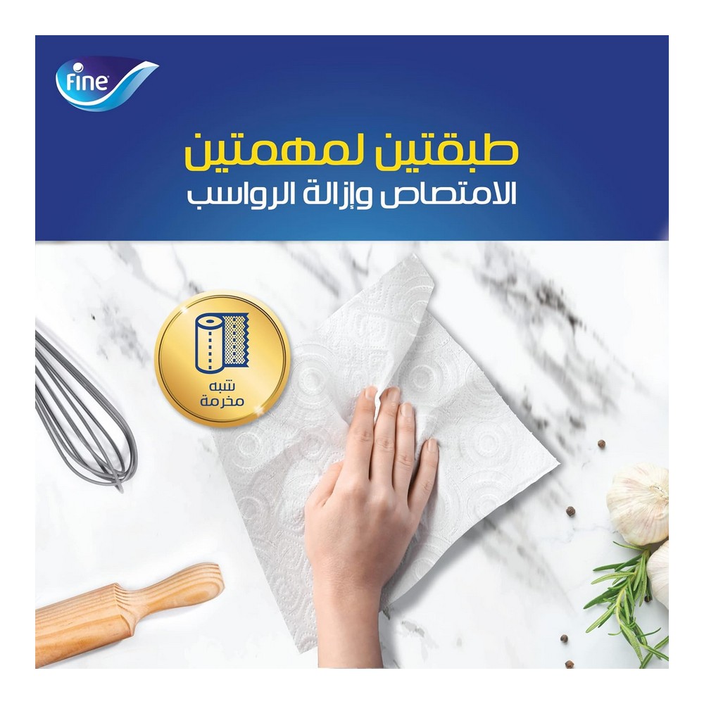 فاين مطبخ تاتش 6 رول || بكرة مطبخ سوبر تاول برو من فاين تقدم لك قوة امتصاص استثنائية تضمن لك أسطح نظيفة وخالية من البقع في جميع أنحاء منزلك. استخدم بكرة المطبخ نصف المسامية هذه بعدة طرق لإنجاز مهامك بكفاءة، مثل تجفيف أدوات المطبخ وأدوات المائدة، التنظيف، أو حتى تلميع الزجاج والأسطح. تتكون فوطة سوبر تاول برو من فاين من 3 طبقات مخصصة لتحقيق امتصاص ونقع وإزالة أي مادة متبقية بكفاءة. يمكنك الاعتماد على منتجات فاين بكل أمان، حيث تم اعتمادها من قبل ايسيغا، المنظمة الألمانية المعروفة بفحص المنتجات لضمان سلامة الطعام. اجعل خيار فاين المطهرة والفعالة جزءًا من روتينك اليومي في المطبخ.