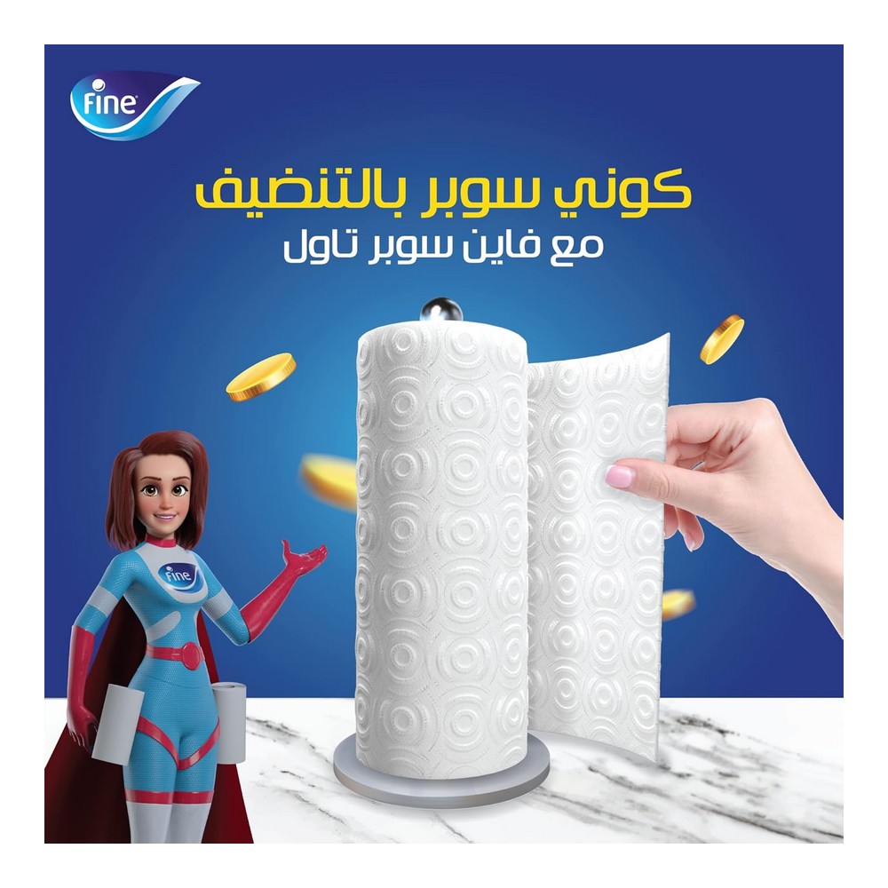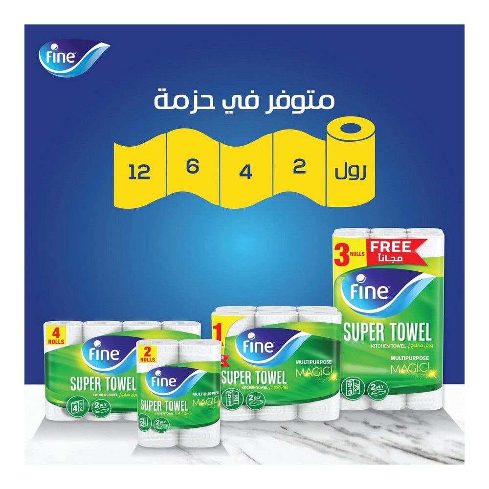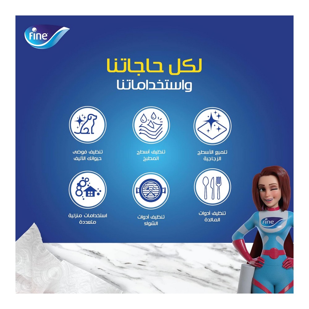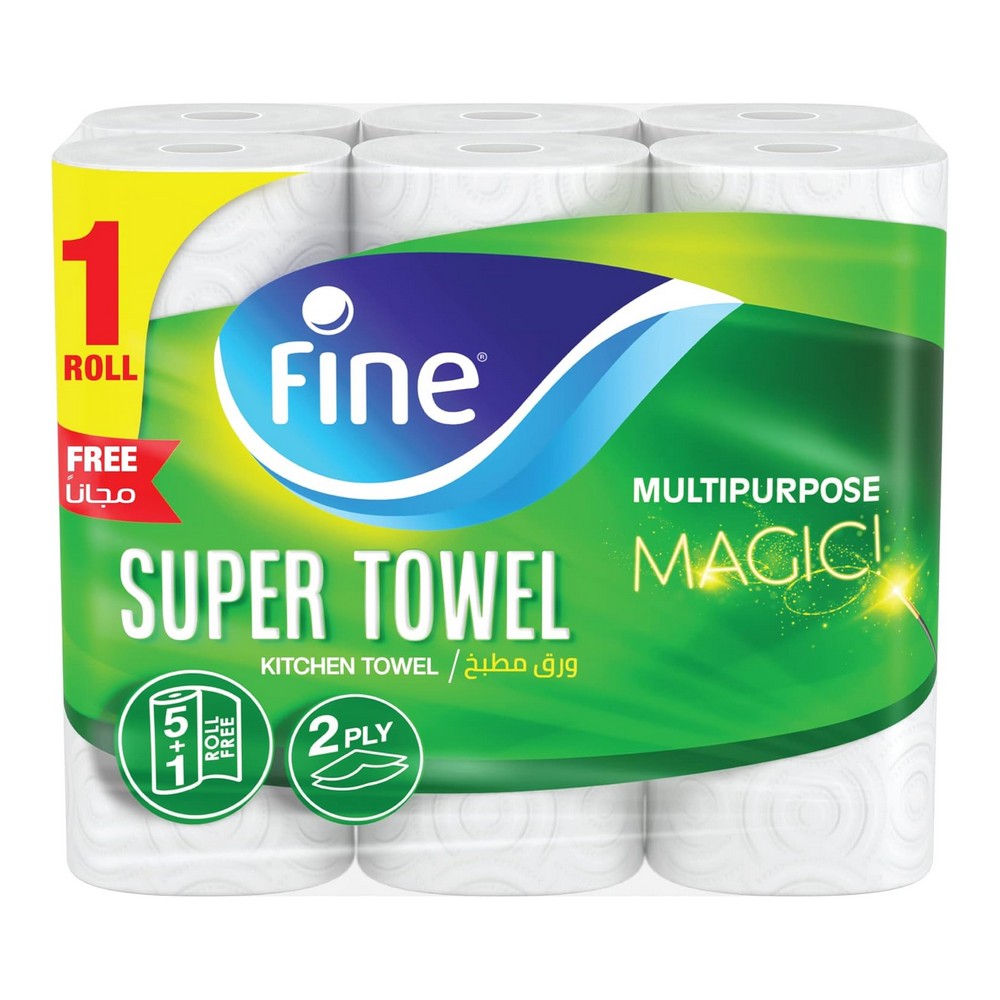 فاين مطبخ تاتش 6 رول || بكرة مطبخ سوبر تاول برو من فاين تقدم لك قوة امتصاص استثنائية تضمن لك أسطح نظيفة وخالية من البقع في جميع أنحاء منزلك. استخدم بكرة المطبخ نصف المسامية هذه بعدة طرق لإنجاز مهامك بكفاءة، مثل تجفيف أدوات المطبخ وأدوات المائدة، التنظيف، أو حتى تلميع الزجاج والأسطح. تتكون فوطة سوبر تاول برو من فاين من 3 طبقات مخصصة لتحقيق امتصاص ونقع وإزالة أي مادة متبقية بكفاءة. يمكنك الاعتماد على منتجات فاين بكل أمان، حيث تم اعتمادها من قبل ايسيغا، المنظمة الألمانية المعروفة بفحص المنتجات لضمان سلامة الطعام. اجعل خيار فاين المطهرة والفعالة جزءًا من روتينك اليومي في المطبخ.