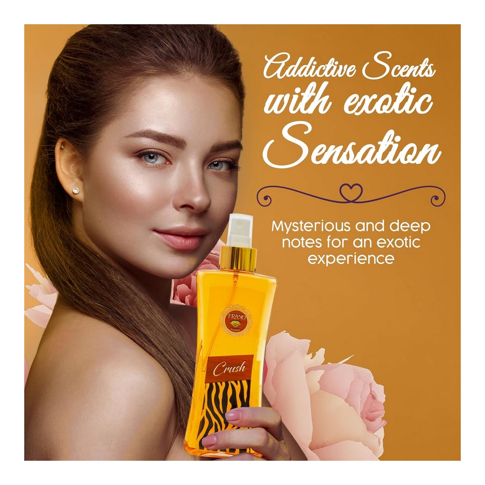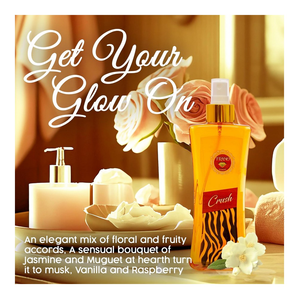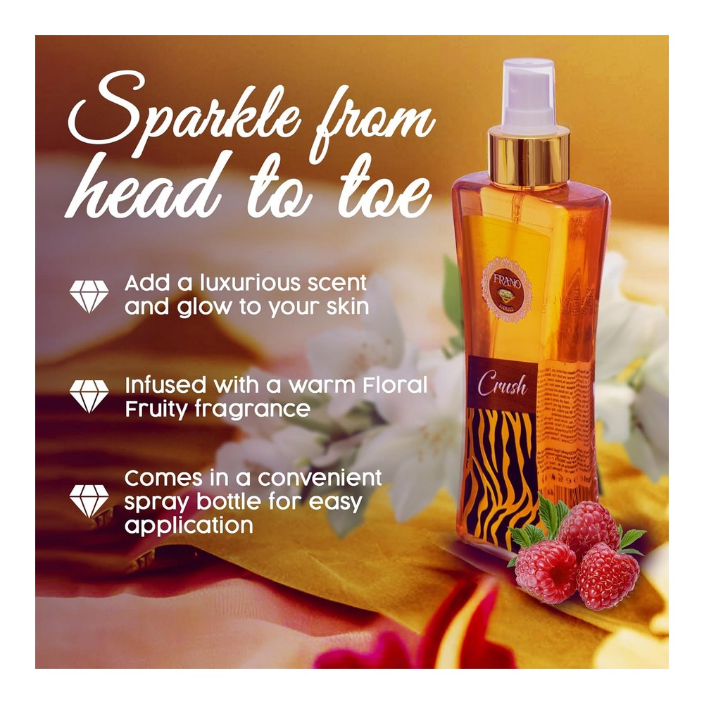 فرانو دياموند بدى ميست كراش اصفر شفاف 250 مل؛ رذاذ الجسم كراش 250 مل يتميز برائحة منعشة وجذابة تدوم طويلاً، مثالي للاستخدام اليومي، يمنحك إحساساً بالانتعاش والثقة. مناسب لجميع أنواع البشرة ويأتي في عبوة سعة 250 مل، تصميمها الأنيق يجعلها إضافة رائعة لمجموعة العناية الشخصية الخاصة بك. مثالي ليكون هدية فاخرة لمن تحب، يضفي لمسة من الفخامة على روتين العناية الخاصة بك.
