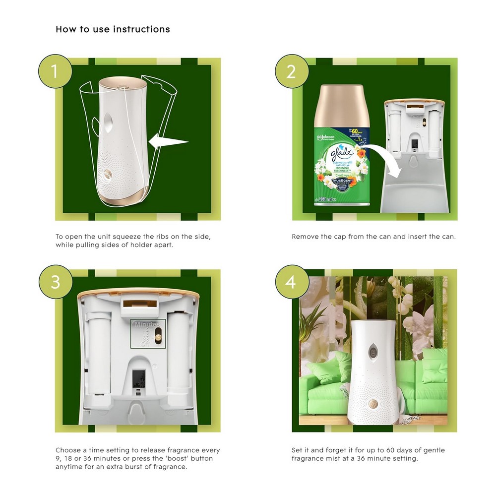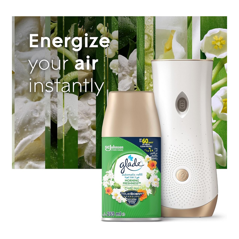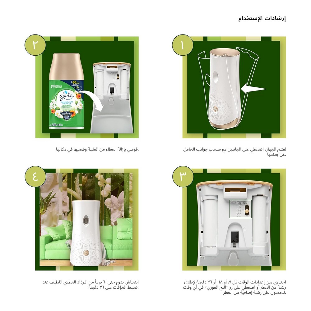 استمتع برائحة التفاح الأخضر والبطيخ المنعشة أسبوعاً بعد أسبوع مع جهاز جلايد الذي يعمل أوتوماتيكياً ليمنحك تجربة انتعاش لا تُنسى. تصميم مزخرف ومحفور يتناغم بسلاسة مع ديكور معظم الغرف، هذه الوحدة المحمولة التي تعمل بالبطارية تضيف لمسة من العطر في أي مكان. يتميز بتصميم مزلاج سهل الفتح، مما يجعل تغيير عبوات إعادة التعبئة أمراً سهلاً ومريحاً. يمكنك ضبط إعدادات الوقت واختيار وضعية رش العطر من ثلاثة خيارات مختلفة، لتناسب أسلوبك المفضل في نشر العطر. دلل حواسك مع جلايد واستمتع بأجواء انتعاش فريدة تملأ كل ركن من أركان منزلك.