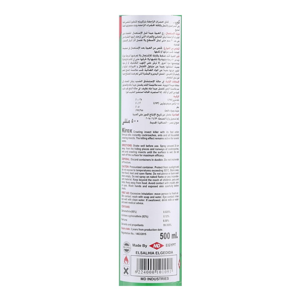 كيروكس قاتل حشرات زاحفة 500 مل هو الحل الأمثل لمواجهة مشكلة الحشرات الزاحفة في المنزل. يتميز بتركيبته الفعالة التي تستهدف الحشرات مثل الصراصير والنمل، حيث يعمل على القضاء عليها بسرعة وكفاءة. يأتي بعبوة سعة 500 مل تسهل الاستخدام والتحكم. يوفر حماية طويلة الأمد، مما يجعل منزلك خاليًا من الحشرات المزعجة. سهل الاستخدام، فقط رش المحتوى في الأماكن المخصصة وستلاحظ الفرق سريعًا. امنح منزلك بيئة آمنة ونظيفة مع كيروكس قاتل الحشرات.