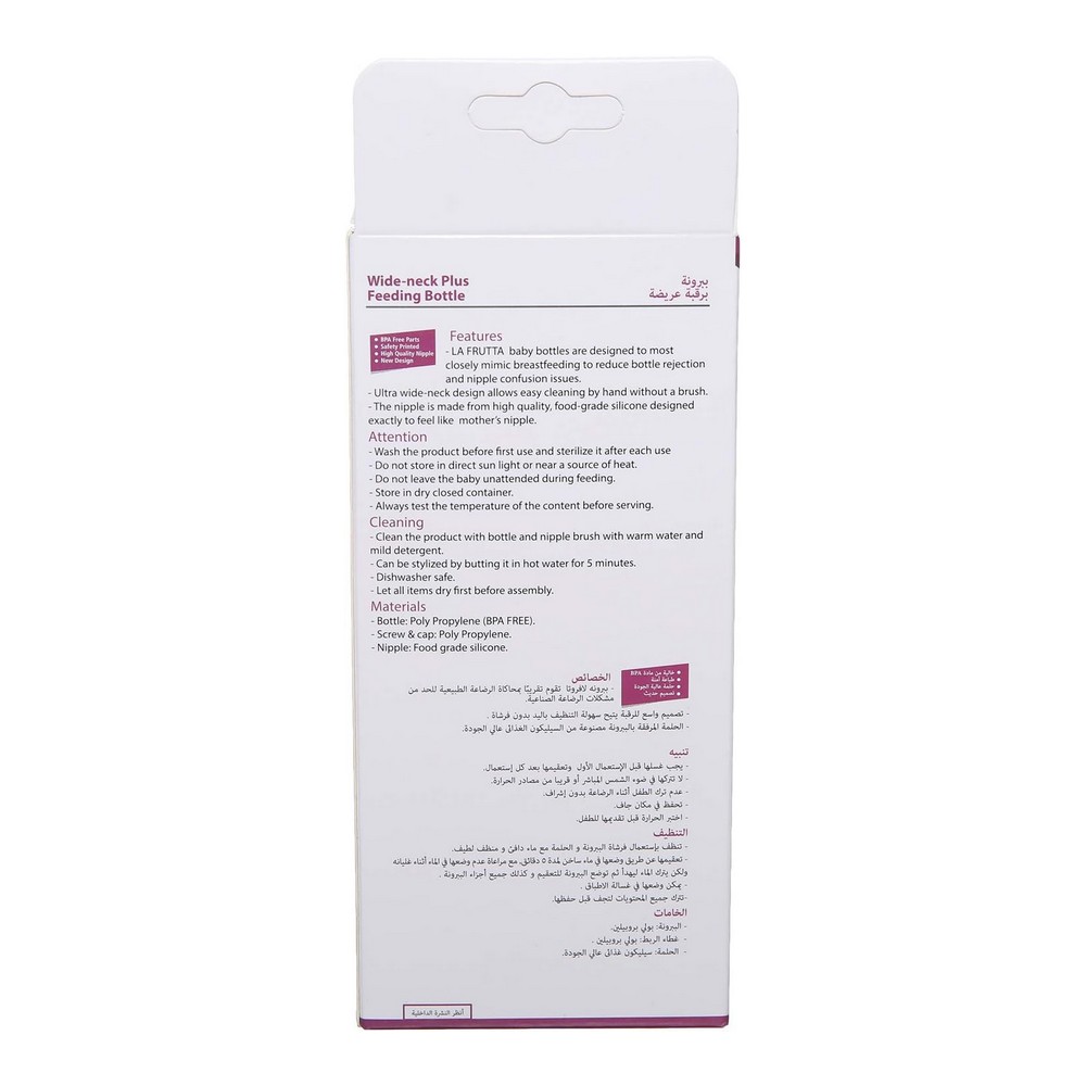 لافروتا ببرونة بلاستيك بدون يد رقبة واسعة 300 مل +0m ** زجاجة رضاعة لافروتا مصنوعة من البلاستيك الآمن بحجم 180 مل مع حلمة سيليكون ناعمة، مثالية للطفل من سن الولادة. تصميم مريح وسهل الاستخدام، ومناسبة للرضاعة الطبيعية أو الاصطناعية، تجعل من تجربة الإطعام أكثر سلاسة وراحة. توفر زجاجة الرضاعة هذه ضمانا للأمان مع مواد خالية من BPA، مما يعزز صحة الطفل ونموه.