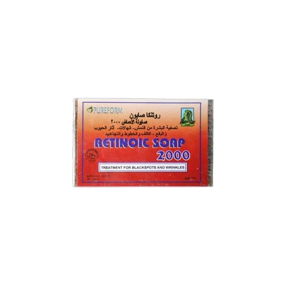 بيورفورم صابونة ريتينويك للبقع السوداء 160 جم || صابون فعال مخصص لتفتيح وعلاج البقع الداكنة، يحتوي على مكونات طبيعية غنية تساعد في تجديد خلايا البشرة وتحسين مظهرها. تمنحك بشرة نضرة وأكثر إشراقًا بفضل خصائصها المغذية. مثالية لجميع أنواع البشرة. احصلي على نتائج مبهرة بفضل تركيبتها الفعالة التي تحارب علامات الشيخوخة وتعمل على توحيد لون البشرة. احصلي على إشراقة وحيوية بشرتك مع صابون بيور فورم.