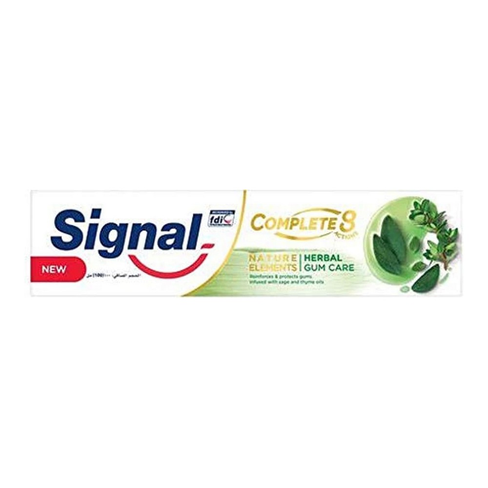 معجون أسنان سيجنال كومبليت 8 بالأعشاب الطبيعية 100ملد. معجون أسنان سيجنال يجمع بين الحماية الكاملة والإضافات الطبيعية الفعالة. تركيبة فريدة تحتوي على زيوت طبيعية مثل المريمية والزعتر، جنبًا إلى جنب مع معدن الزنك، لضمان قوة فعالة مضادة للبكتيريا. مناسب لجميع أفراد العائلة، يعمل على تقوية وحماية اللثة والحد من مشكلات الفم. لا يحتوي على التريكلوسان أو البارابين، مما يجعله اختيارًا آمنًا وصحيًا لعناية فمك. استمتع بابتسامة صحية وجميلة مع معجون سيجنال المتطور.