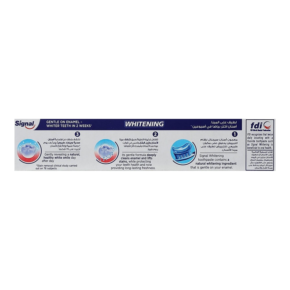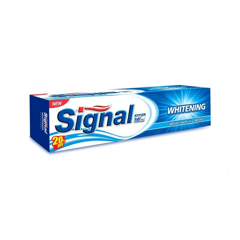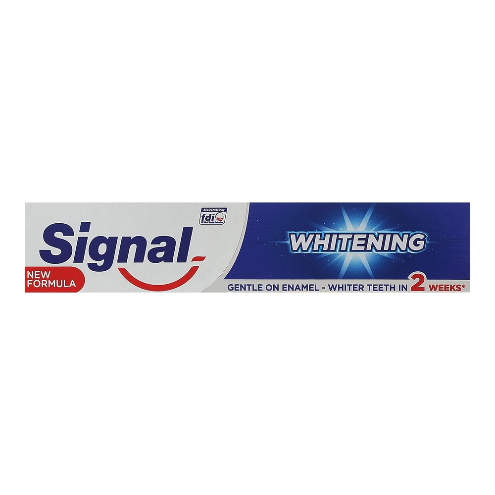 يتميز معجون سيجنال المبيض بتركيبته الفريدة التي تحتوي على الكالسيوم الدقيق، مما يساعد في معالجة الثقوب الصغيرة الظاهرة وحماية الأسنان من التسوس. كما يحتوي على مركب البرو-فلوريد الذي يوفر حماية طويلة الأمد، ويمنحك نفساً منعشاً ورائحة لطيفة تمتد طوال اليوم. احصل على ابتسامة صحية ومتألقة مع سيجنال، المصمم خصيصاً لمظهر أسنان رائع وأقصى درجات النظافة.
