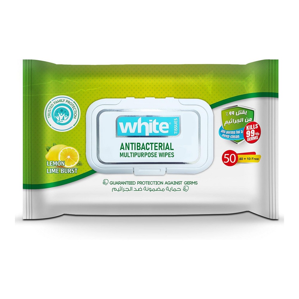 وايت مناديل مبللة مضاد البكتريا 50 منديل مناديل وايت المُضادة للبكتيريا مُتعددة الأغراض مع انفجار الليمون توفر لك حماية فعالة ضد الجراثيم للأيدي والأسطح. بفضل قدرتها على قتل 99% من الجراثيم، تمنحك تنظيفًا عميقًا ولمسة ناعمة بفعل الجليسيرين، مما يجعلها الخيار المثالي للحفاظ على النقاء والنظافة. استخدمها في المنزل أو المكتب لتجربة حماية مريحة وآمنة مع روائح منعشة.