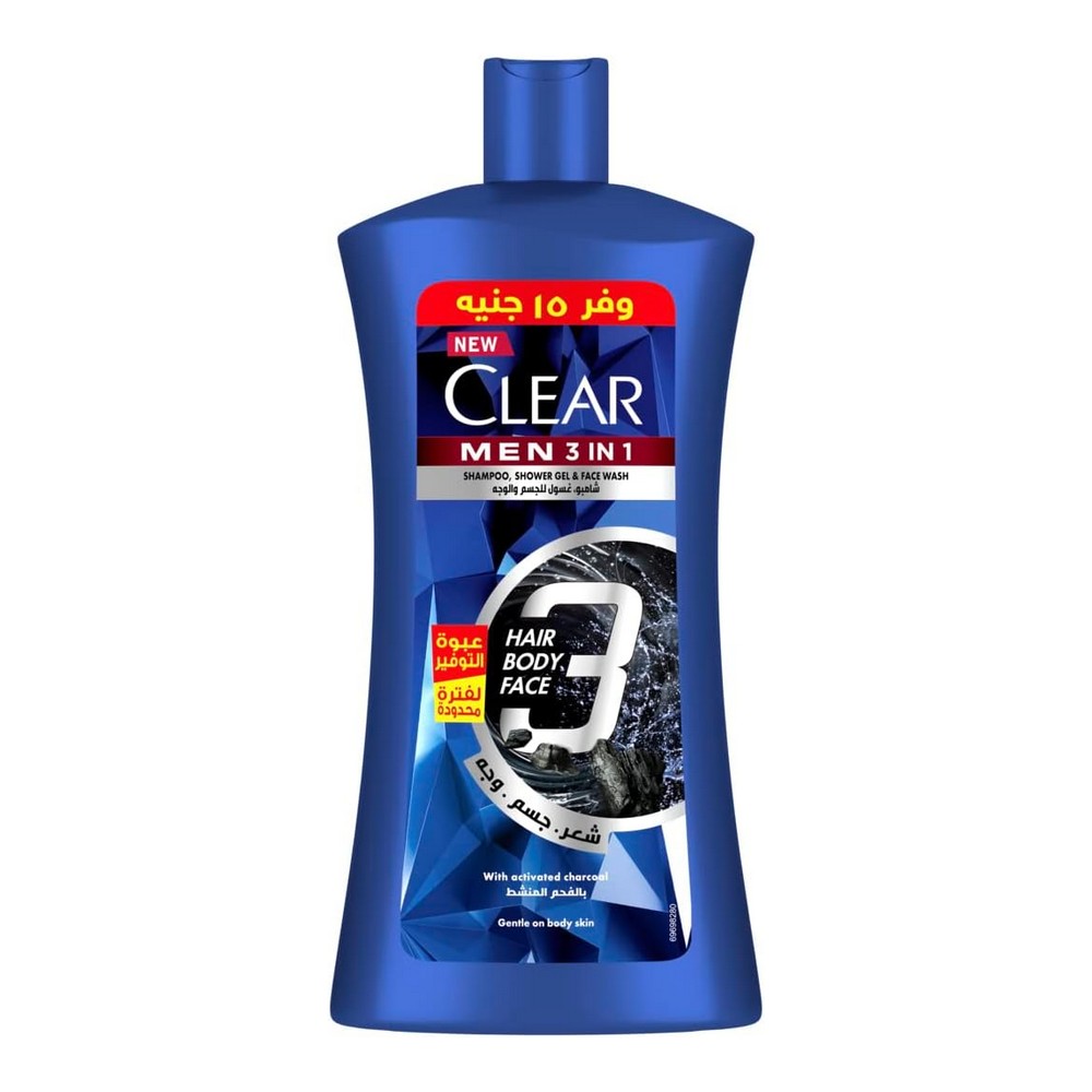 كلير شامبو للشعر والجسم والوجه بالفحم النشط 900 مل - وفر 15 جنيها كلير مين شامبو كومبليت كير 3 في 1 هو الحل المثالي للعناية الشاملة من الرأس حتى أصابع القدم. تركيبة غنية بالفحم النشط تمنحك فعالية قوية ضد القشرة، مع الحفاظ على نعومة ولطف على بشرتك. مثالي لجميع أنواع الشعر والجسم، استخدمه للحصول على بشرة نضرة وشعر صحي وحيوي. جربه الآن وتمتع بنظافة وانتعاش يدوم طويلاً.