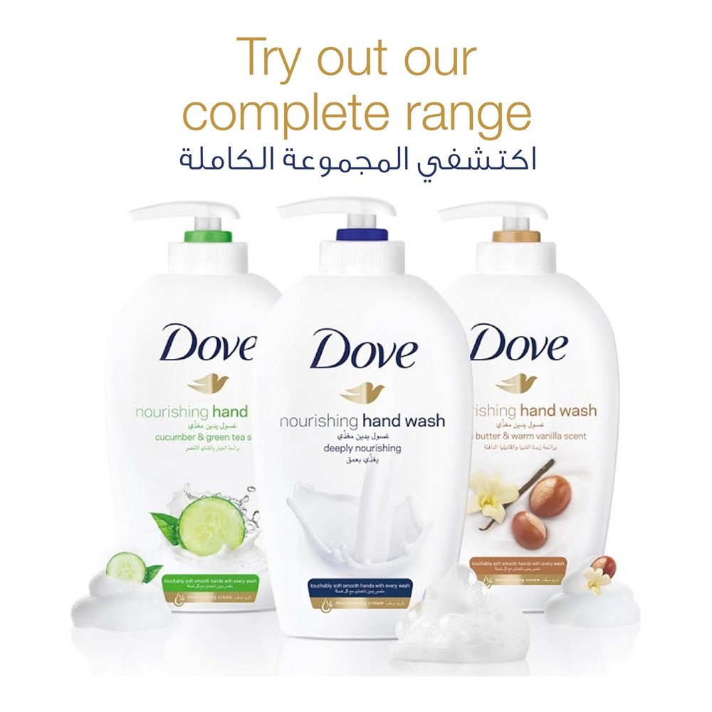 دوف هاند ووش عناية وحماية مرطب 500 مل || دوف غسول اليدين المنعش بخلاصة الخيار والشاي الأخضر يقدم تركيبة مرطبة لتنظيف فعال وحماية لليدين من الجفاف. يناسب البشرة الحساسة ويضمن نظافة اليدين اليومية. يتميز برائحة لطيفة تضفي لمسة مهدئة أثناء الاستخدام. غنية بالكريم المرطب الفريد، تمنح يديك نعومة وشعور بالعناية مع كل استخدام. غسول اليدين الأصلي من دوف يجعل تجربة غسل اليدين منعشة ويترك البشرة منتعشة ومتألقة. تركيبة خاصة غنية بالكريم المرطب تجعل يديك ناعمة وطازجة. استمتع برائحة الخيار والشاي الأخضر المنعشة مع غسول اليدين اللطيف. يجمع بين خفة التركيبة والرائحة المهدئة مع كريم مرطب يوفر عناية لبشرتك. فقط ضعي مضخة من دوف على راحة يدك المبللة ورغويها بلطف قبل الشطف. استمتعي بالعطر الرقيق والشعور بالنظافة والانتعاش. تجنبي ملامسته للعينين، وفي حالة الملامسة، اشطفيه جيدًا بالماء. اكتشفي مجموعتنا الكاملة من المنتجات المتميزة بمكونات مختلفة مثل زبدة الشيا والفانيليا الدافئة.