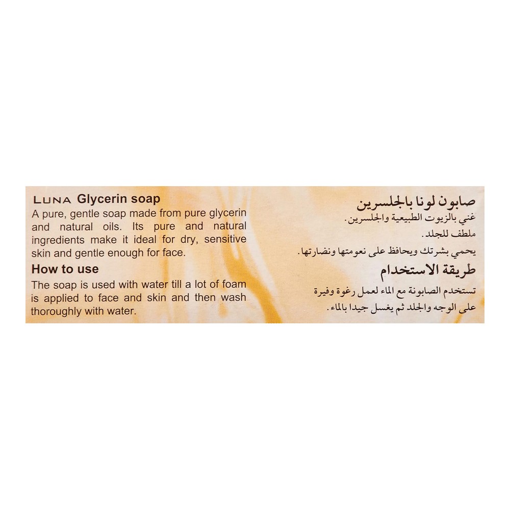 لونا صابون جلسرين شفاف 115 جم صابون شفاف ونقي مصنوع من الجل​سيرين النقي والزيوت الطبيعية. يجمع بين التفتيح والترطيب، مما يجعله الخيار المثالي للبشرة الجافة والحساسة. يعزز رطوبة البشرة ويحافظ على نعومتها، ولطيف بما يكفي للاستخدام اليومي على الوجه. تمتزج فيه مكونات طبيعية لضمان تجربة تنظيف فريدة بدون تهيّج. احصل على لمسة طبيعية لبشرتك مع هذا الصابون المثالي.
