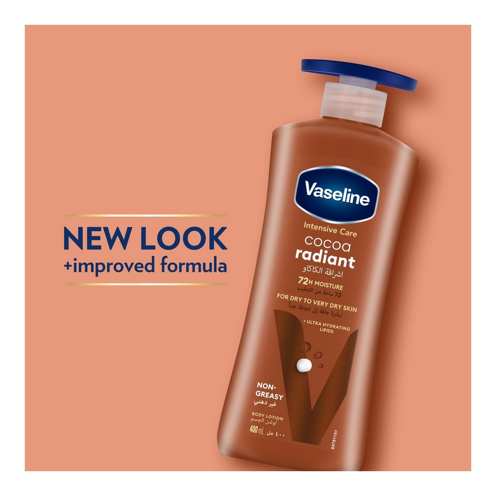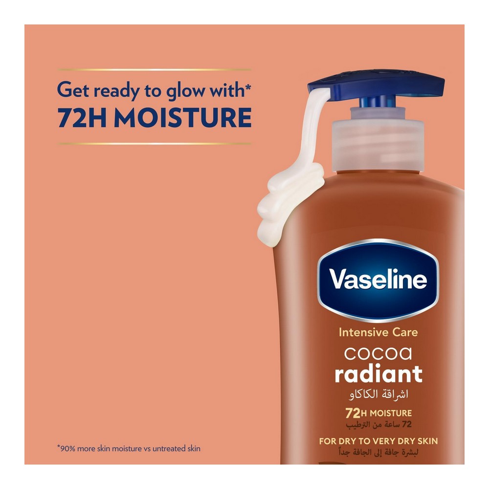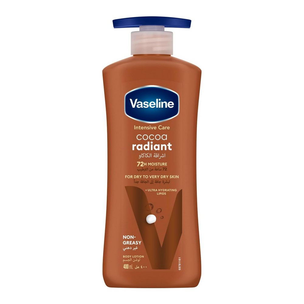 مزايا المنتج تشمل العلامة التجارية فازلين، لوشن للجسم بحجم 400 مل. يعمل على ترطيب ثلاث طبقات عليا من الجلد السطحي (الطبقة المتقرنة) بفعالية. يتميز بسرعة امتصاصه دون ترك أثر دهني. مثالي للبشرة الجافة والباهتة، حيث يسهم في شفاء البشرة ويعزز توهجها الطبيعي. منتج مغذي يقدم ترطيبًا يستمر لمدة 24 ساعة لبشرة صحية ومتوهجة. تجربة فريدة مع زبدة كاكاو نقية ومرطبات متعددة الطبقات تمنحك إشراقة تدوم.